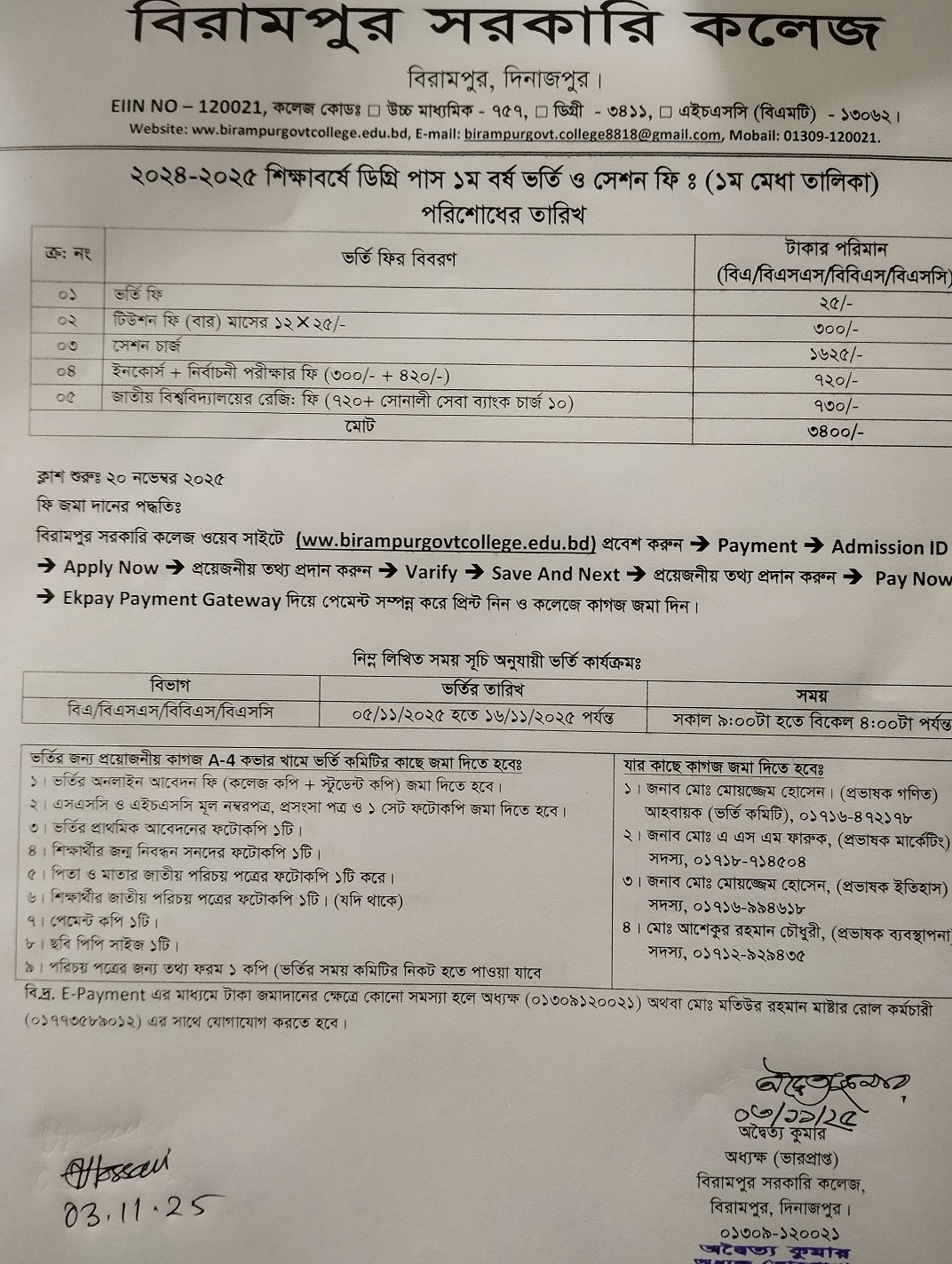 | 15 | 2025-11-23 | ২০২৪-২০২৫ শিক্ষাবর্ষে ১ম বর্ষ স্নাতক (পাস) ভর্তি ১ম মেধা তালিকায় ভর্তিকৃত শিক্ষার্থীদের কোর্স পরিবর্তন, ২য় মেধা তালিকা প্রকাশ ও কলেজ কর্তৃক চূড়ান্ত ভর্তি নিশ্চয়ন সম্পর্কিত বিজ্ঞপ্তি | View Download |